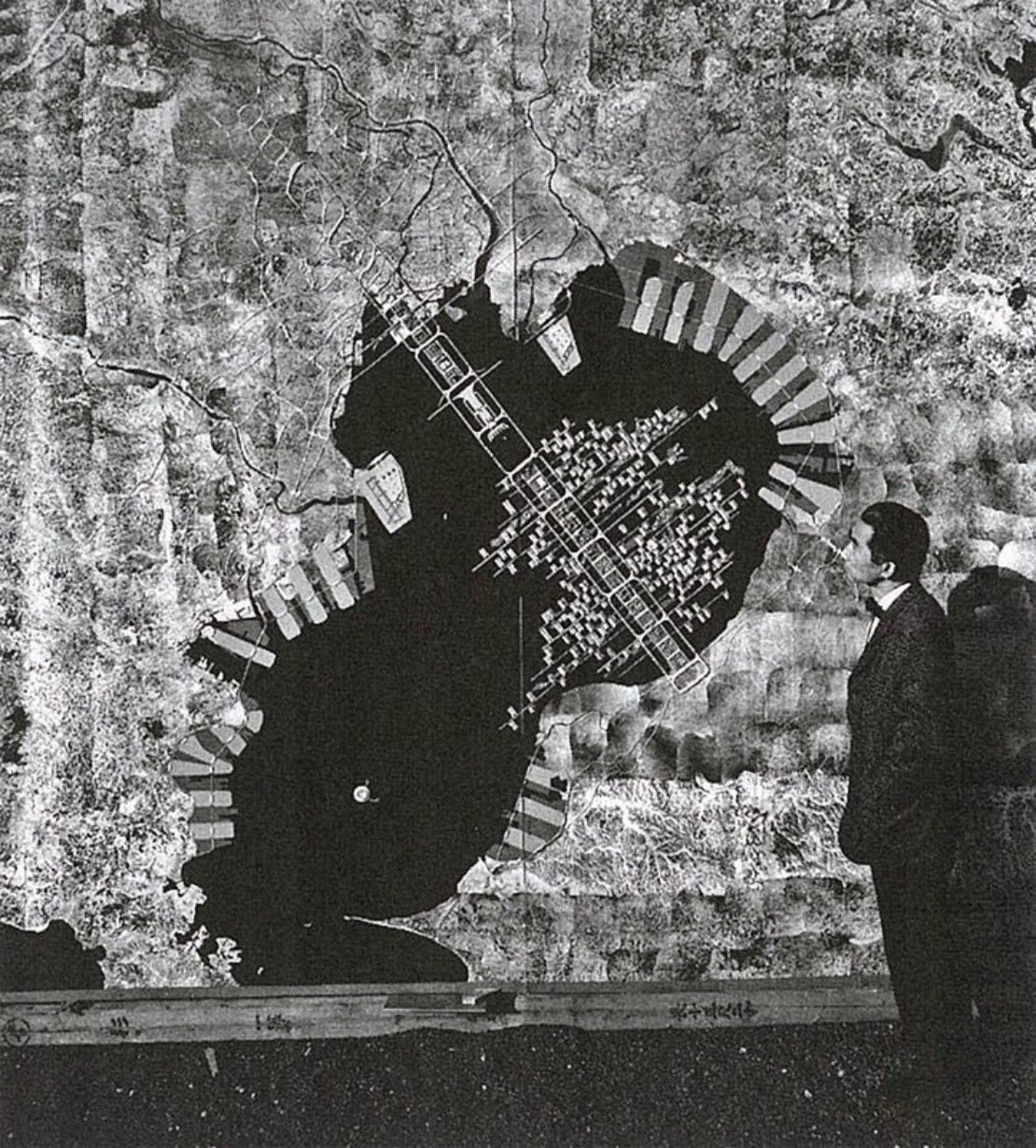 Kenzō Tange in front of his 1960 plan for Tokyo Bay