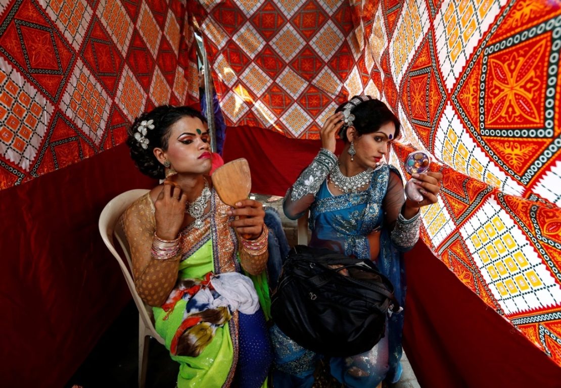 There is something bordering on the obscene about Sir Peter Lely's Two Ladies of the Lake Family (c1660). Although in a formal pose, these gentlewomen are bursting out of their low-cut dresses and the presence of a guitar hints at impropriety and parties – the instrument had only just become fashionable. It draws a gorgeous comparison with this colourful Reuters photograph, taken in August, of eunuchs applying make-up before Raksa Bandhan festival celebrations in a red light district of Mumbai. The busy patterns, sumptuous fabrics and pouting gestures give the impression that both sets of subjects are putting on a peacock-like display of beauty.