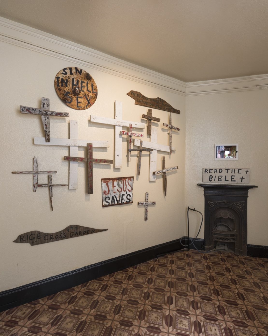 In the small back room, hastily crafted crucifixes by another religious American outsider, William Carlton Rice, are tacked up on the walls along with the sober warning: "You will die." (Rice made thousands of these crucifixes.) Also there are fragments of intense carvings by Karl Junker, who confined himself to the attic of his Junkerhaus so that he could turn the rest of the building into a life-size doll's house.