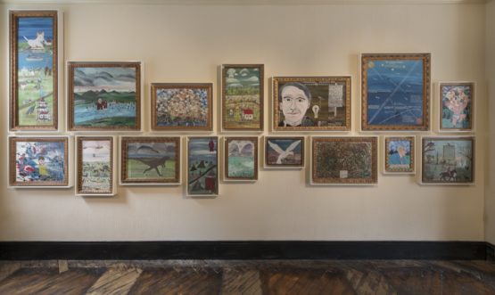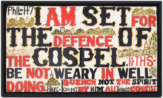 Inside the gallery, a slice of Paradise Gardens has been recreated: the colourful, primitive paintings inscribed with sometimes profound, sometimes illiterate, often surprising and beautiful phrases, are hung close together, almost haphazardly. Even the frames have been handmade by Finster who, legend had it, slept just 15 minutes a day.
