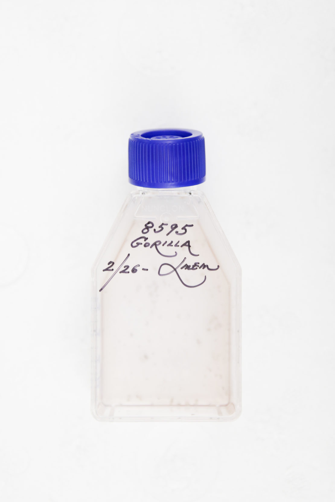 In the cell culture lab, Dr Korody incubates the chunks of mouse matter for six hours, mixing them with an enzyme that digests the tissues and liberates the cells. The cells will next be kept here to grow – a process that takes anywhere from three weeks to more than a year, depending on the individual specimen. While we are in the lab, the cells of gorillas and southern white rhinos sit developing on the shelves.