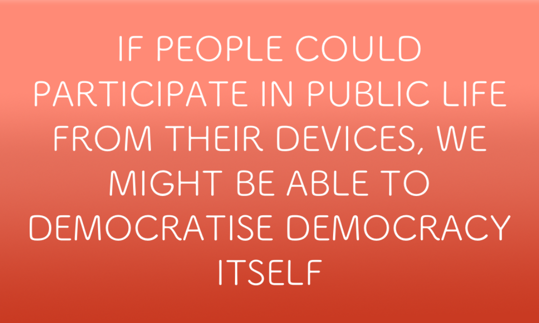 If people could participate in public life from their laptop (or smartphone, or gaming platform), we might be able to democratise democracy itself, in all sorts of salutary ways. We might fold in all those who, by dint of their work, childcare or family obligations, are too exhausted or pressed for time to attend a decision-making assembly, and prevent the common circumstance in which such an assembly is captured by a bad-faith participant with an axe to grind. We could avoid having to gather stakeholders in a given place and time to make decisions of common import, and allow people to participate in public life as and when they were able to. And we could apply to that participation all the tools that arise from being networked and digital, particularly the ability to capture and analyse detailed data about a matter up for discussion.