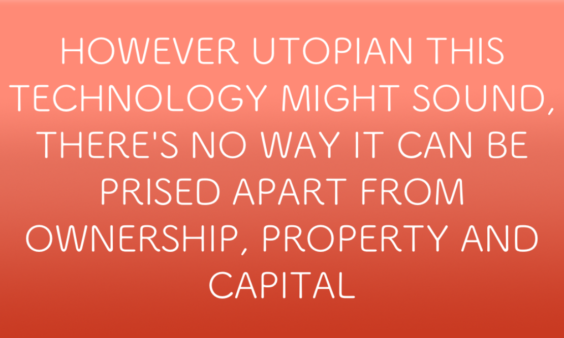 However utopian a politics of distributed consensus might sound to us, then, there's no way in which it can be prised apart from the entirely conventional constructions of ownership, private property and capital accumulation at its very heart, at least not in its present form. The profoundly murky quality of blockchain technology – and the relative lack of accessible but technically sophisticated resources that might explain it – thus causes some of us to endorse a set of propositions we'd otherwise recoil from. We criticise lack of government transparency, yet the blockchain is unfathomable to most people.