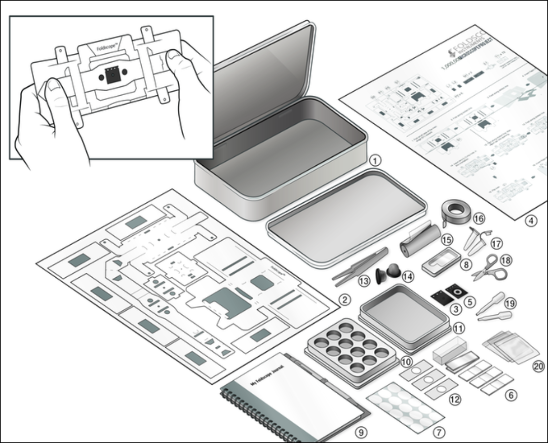 An ingenious series of origami folds, executed by the user within a few minutes, suspend and protect a powerful, grapeseed-sized lens. A traditional glass slide, or a simple piece of sticky tape, holds a sample below. Adjusting the pressure of your thumbs lets you focus with micron precision.