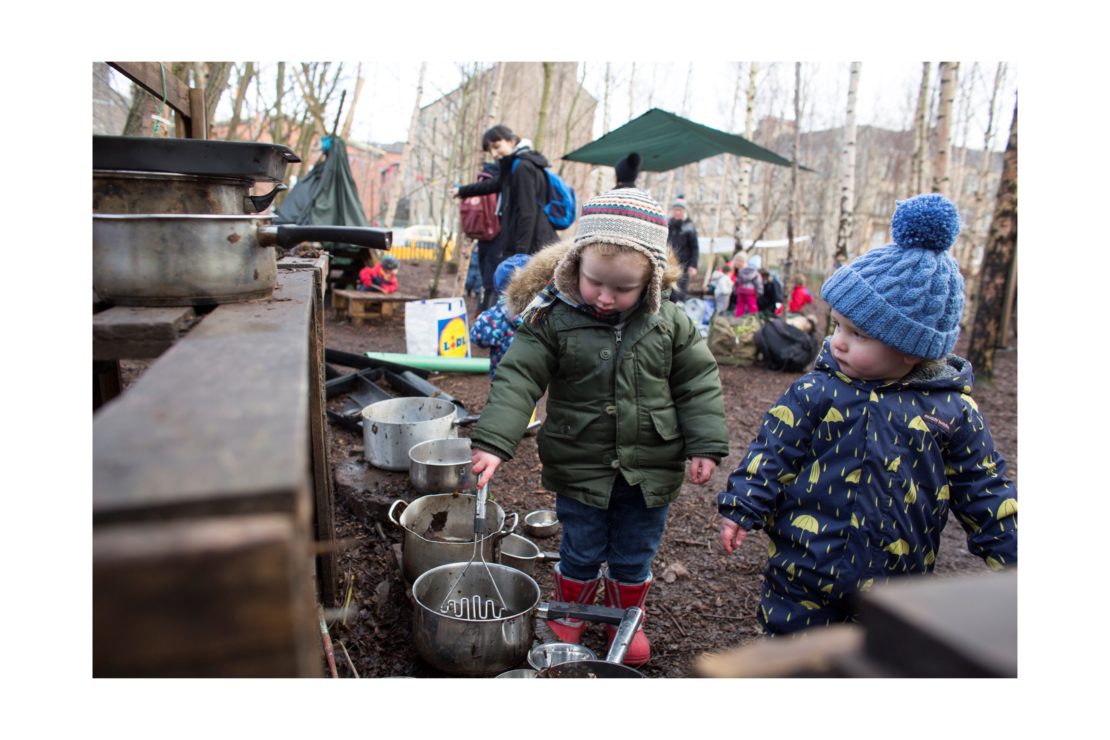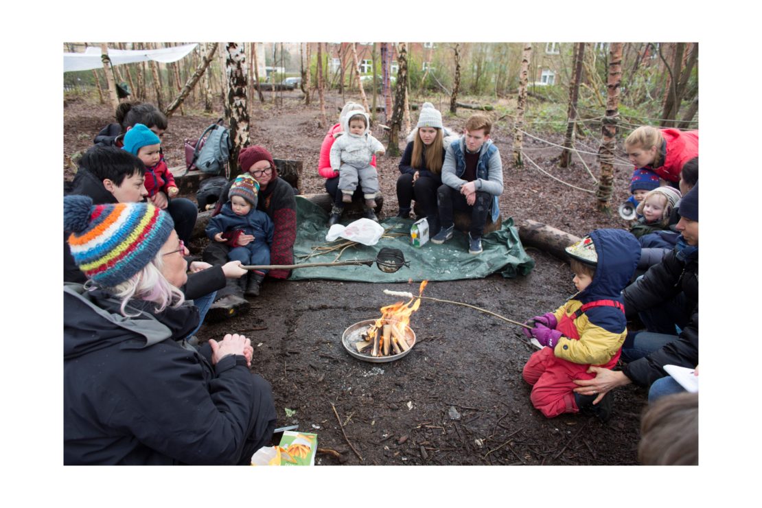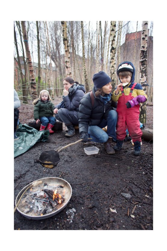 On a chilly February morning in Glasgow, Stephanie Anthony and her three-year-old son Ilan are perching on a log in front of a small bonfire. They are making popcorn with kernels, using two sieves tied together with string, and are surrounded by a warm circle of toddlers, mums, dads, aunties, grannies and childminders from the local area.