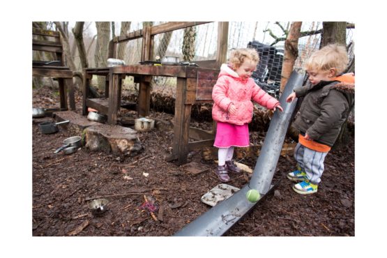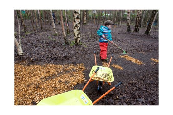 A few yards away, Monroe, two, is also 'cooking', sloshing earth and grass carefully in a saucepan in the mud kitchen. Preschoolers Reuben and Benjamin are making a woodchip path, wheeling little barrows back and forth from a large pile. On the adjoining meadow, dogs and their owners enjoy a stroll and a chat. A colourful signpost arrow points straight ahead for 'Wonderland'.
