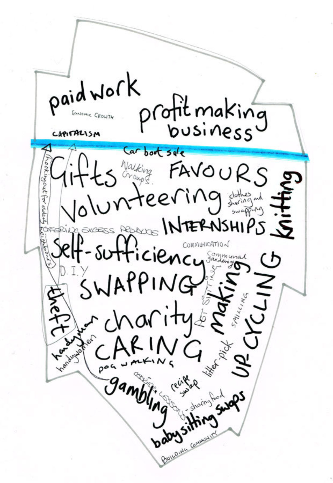 Ailie Rutherford, the artist who organised the meeting, is at the other end of the table drawing a picture of a sewing machine on to the bottom half of a cardboard model iceberg. Rutherford borrowed the iceberg concept from feminist political economist duo JK Gibson-Graham as a metaphor for the many alternative economic exchanges that take place under the surface in Govanhill, where community and faith-based transactions are often not valued in terms of hard currency. The sewing machine is to symbolise the unpaid work of mending clothes, at the suggestion of one of the Pakistani women.